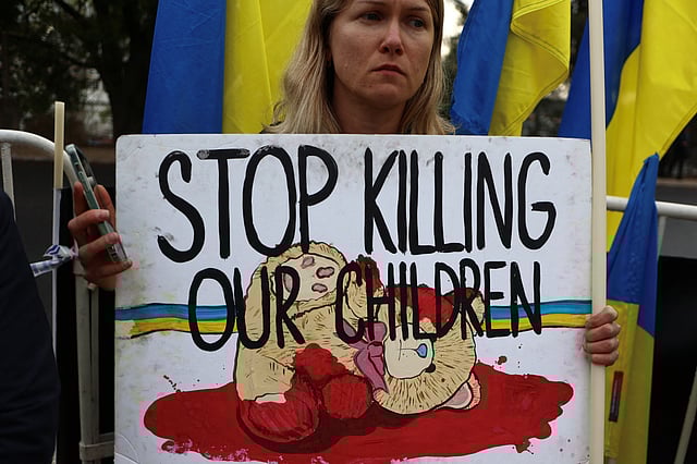 Outside the embassy, protesters held signs saying "Russia is a terrorist state" and "Stop killing our children".