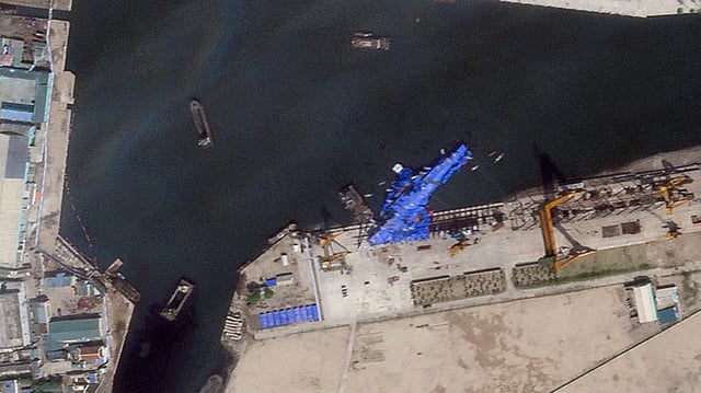 Satellite imagery shows the warship, covered in blue tarps, lying on its side, with the stern swung out into the harbor, but the bow remaining on the side slipway, according to the U.S.-based Center for Strategic and International Studies (CSIS).