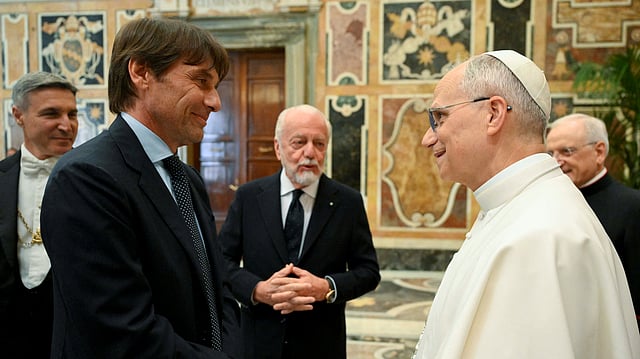 Coach Antonio Conte, whom De Laurentiis introduced as "deeply Catholic", knelt down and kissed the pope's hand, before Leo told him he had seen him many times on TV.